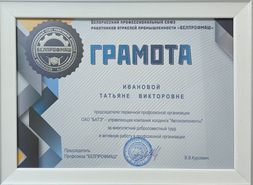 В числе награжденных — председатель первичной профсоюзной организации ОАО «БАТЭ»-управляющая компания холдинга «Автокомпоненты» — Татьяна Иванова.